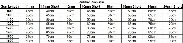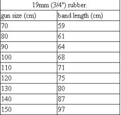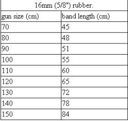 Jeśi używamy podwójnych gum wybieramy długość kuszy ale używamy następną największą średnicę dla długości każdej gumy