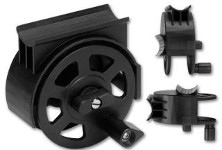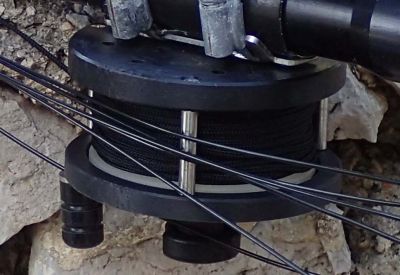 2 Nawijamy linkę na kołowrotek, nie za dużo bo kołowrotek będzie się zacinał ( ok. 5mm prześwitu ). Mocujemy kołowrotek na kuszy i dokręcamy śruby obejm