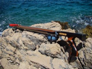 Achilles 110 - Kusza dla doświadczonych spearos, na większe ryby, aspetto i blue water. Albo jedna guma 20mm albo dwie po 18mm. Strzała 6,5mm o dług 150cm(shark fin). Kołowrotek z linką nawet do 80m.
