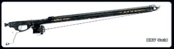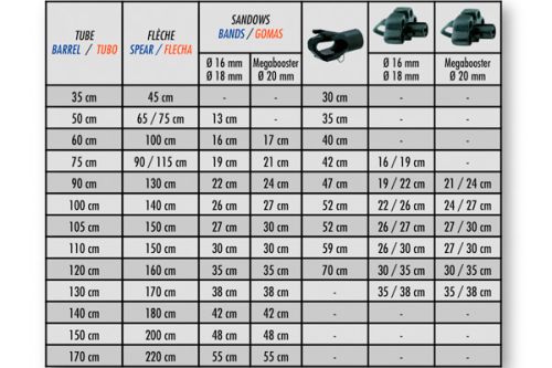 Wersje 50,60,75,90 i 100cm. Aluminiowa lufa 25mm. Nisko profilowana głowica, prowadnica strzały i automatyczny zwalniacz linki. Solidny system spustowy. Gumy 16mm latex. Strzała 6mm Inox Tahitiana