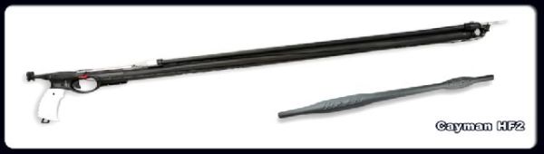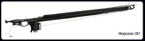 Nowa ergonomiczna rękojeść. Bardzo czuły mechanizm spustowy i odporny na ciągniecie widełek. Uchwyt rękojeści pochłania odrzut i jest wygodny w celowaniu. Linka zwalnijąca jest na boku pozwalając aby była użyta także z kołowrotkiem. Bardzo wąska prowadnica kołowrotka, co pozwoliło na zminimalizowanie odległości między kołowrotkiem a lufą. Rękojeść Cayman ma dwa wymienne klatkowe ochraniacze w różnych rozmiarach i dwie wymienne rękojeści (dla prawo i leworęcznych). Lufa Cayman ma zintegrowaną prowadnicę strzały z zewnętrzną 28mm lufą. Zwiększona o 20% odporność na wyginanie. Węglowa lufa Cayman to 25mm lufa z polimerów węglowych . Grubość ścianki 1,5 mm i zintegrowana prowadnica strzały. Specjalny profil przyczynia się do większej sztywności lufy przy maksymalnej dokładności celowania. Lufa HF została wykonana przy zastosowaniu pionierskiej metody hydroformowania. Rezultatem jest inowacyjna geometria a co za tym idzie duża pływalność(dzięki większej lufie wewnętrznej), stabilność i hydrodynamika. Sztywność o 33% procent większa od innych luf z polimerów węglowych.
