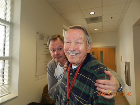 Duane, K4UW, volunteer examiner, with John, KK4AHY, behind him. |