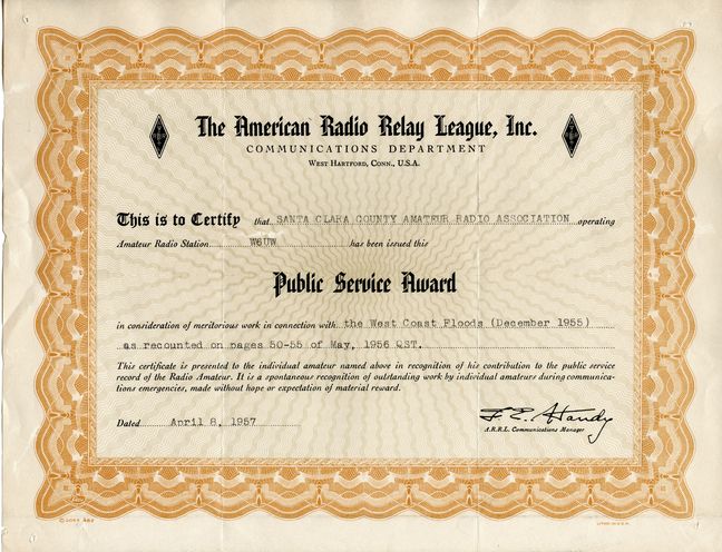 Public Service Award from the ARRL in recognition of SCCARA providing emergency communications during the West Coast floods in December 1955. It was written up in QST magazine, May 1956, pages 50-55.