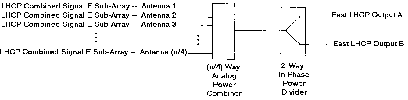 As seen in Figure 4, for each of the four sub-arrays, the RHCP an LHCP combined signal outputs from Figure 3 are combined in an x-way analog power combiner (where x equals four for the sixteen-dish array described here, but for larger n-dish arrays will be n/4). The combined signals representing each of the four sub-arrays are then split into two identical signal components, A and B in Figure 4.