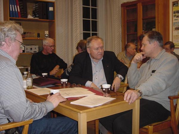 Efter årsmötet samtalar SM3GUJ/Rolf och SM3AFT/Lennart (ordförande i Härnösands Sändareamatörer, SK3AH) och SM3ESX/Christer (ordförande i Sundsvalls Radioamatörer, SK3BG). I bakgrunden syns SM3ETC/Jan.