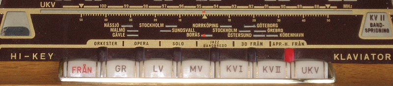 En av tangenterna är avsedd för lokalstationen och spolsatsen som på mitt exemplar är avsedd för mittdelen av MV-bandet (900-1200 kHz) är utbytbar på en rörhållare. När P2 började sändas på UKV-FM 1956 var det många som istället för att köpa ny radio skaffade en tillsats att kopplas till grammofonuttaget. I denna radio har en händig person byggt in tillsatsen så att dess kontroller sitter i en ursågad bit på vänstergaveln, en unik lösning som gör radion användbar för dagens programutbud.