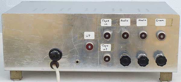 Denna förförstärkare från andra halvan av 1950-talet är ett prydligt hembygge men inte mitt, jag betalade 40 kr för det på auktion. Det innehåller tre dubbeltrioder ECC83 och likriktare med selenbryggor för anod- och glödspänning, bygget kan vara utfört efter artikel i Radio & Television eller en bok av Jan Bellander. På fronten bakom plexiglas är tonkontrollerna märkta med dB relativt 1 kHz och förutom volymkontrollen som saknar uttag för styrkeberoende tonkompensation finns en dämpsats med 10 dB-steg. I grammofonläget är känsligheten 4 mV för 1 V ut vid magnetisk pickup och 100 mV för kristallpickup, i bandläget 225 mV. Tydligen ägde byggaren två FM-tillsatser, något som får mig att gissa på 1956 som byggår. För grammofonavspelning finns omkopplingsbara filter för motorbuller (fungerar inte nu) och skivbrus samt val av frekvenskompensering för de olika standarder som skivbolagen hade före 1960-talet. "Rak" användes med kristallpickup. Ljudentusiasten hade nog märkt skivkonvoluten beroende på bolag och årtal. Framfötterna innehåller indikeringslampor, på baksidan har tre ingångar egen nivåkontroll. Chassi. Baksida.