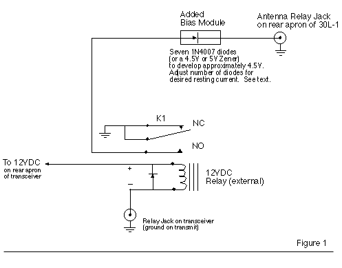 Wiring up an older HF linear amplifier to a newer solid state transceiver Some tips from Tom, W4OKW Here is a nice article (see below) concerning using an external amplifier. This is specific to the Collins 30L1, but applies to Heath SB-200 and similar amps using the 811A or 572B tubes. Any "older" linear amp will most likely need the relay interface to prevent blowing the switching transistor or relay in the solid state rig. All the parts are junque box or radio shack stuff. I built mine in a small R-S minibox and included the 7 diode bias mod in the minibox for a "no holes mod" on the 30L-1. Typical Icom rigs will sink 13.8 volts at 20 mils for the relay. The -170 volts on the amp keying jack will send that little bit of silicon to it's "happy hunting ground"! If you use a honkin' big relay for your box, a transistor driver is easy to include in the interface box. The problem stems from the fact that when these amps were designed, the typical AC line voltage was 110-115 volts, today it runs around 125 or so. I often see 127 at my house. This results in higher B+ on the tubes and more importantly, a higher tube dissipation at idle (PTT exerted, with no RF drive). The way this works is that when unkeyed the amp has -170 on the grids to cut them off. When the keyline (PTT) is grounded, the bias goes to zero and the tubes conduct. Since the B+ is now greater than the 811s were designed for in zero bias operation, they conduct heavily. The result is a lot of heat and the tube's life is shortened. Most amps using the 572B tube don't have the bias problem, it only seems to be applicable to 811A amps. Some of the amps such as the Heath SB-200/201 have a high bias voltage on the keying jack and need the interface box, as do the older SB-220/L-4B/Collins 30S1 amps. I suspect most new amps have been designed for 12 volt keying, but be sure to check the specs before you nuke that nice new transceiver! (This is the big "takeaway" from this ramble!) The 30L1 is a nice amplifier, but getting on in years. A good idea is to replace the existing diode board and capacitor bank with new ones. There are several kits available at a reasonable price. It is an especially good idea if you power up the amp for the first time and fill the house with that rotten smelling electrolytic smoke! You may wind up with an amplifier other than a Collins, but the ideas are worth keeping in the file. 73 Tom