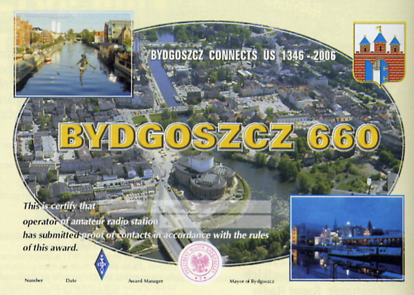 Bydgoszcz 660 Award Dyplom wydawany jest przez Urząd Miasta Bydgoszczy oraz Zarząd Oddziału Terenowego PZK (OT nr 4) dla upamiętnienia 660 rocznicy nadania praw miejskich przez króla Kazimierza Wielkiego. regulamin... |