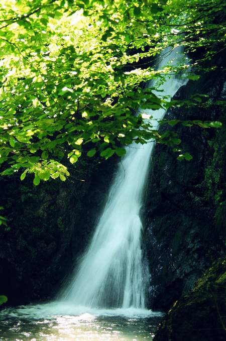 yükseklikten dökülen suyun doğal coşkusunun değişik ağaç türleri ile