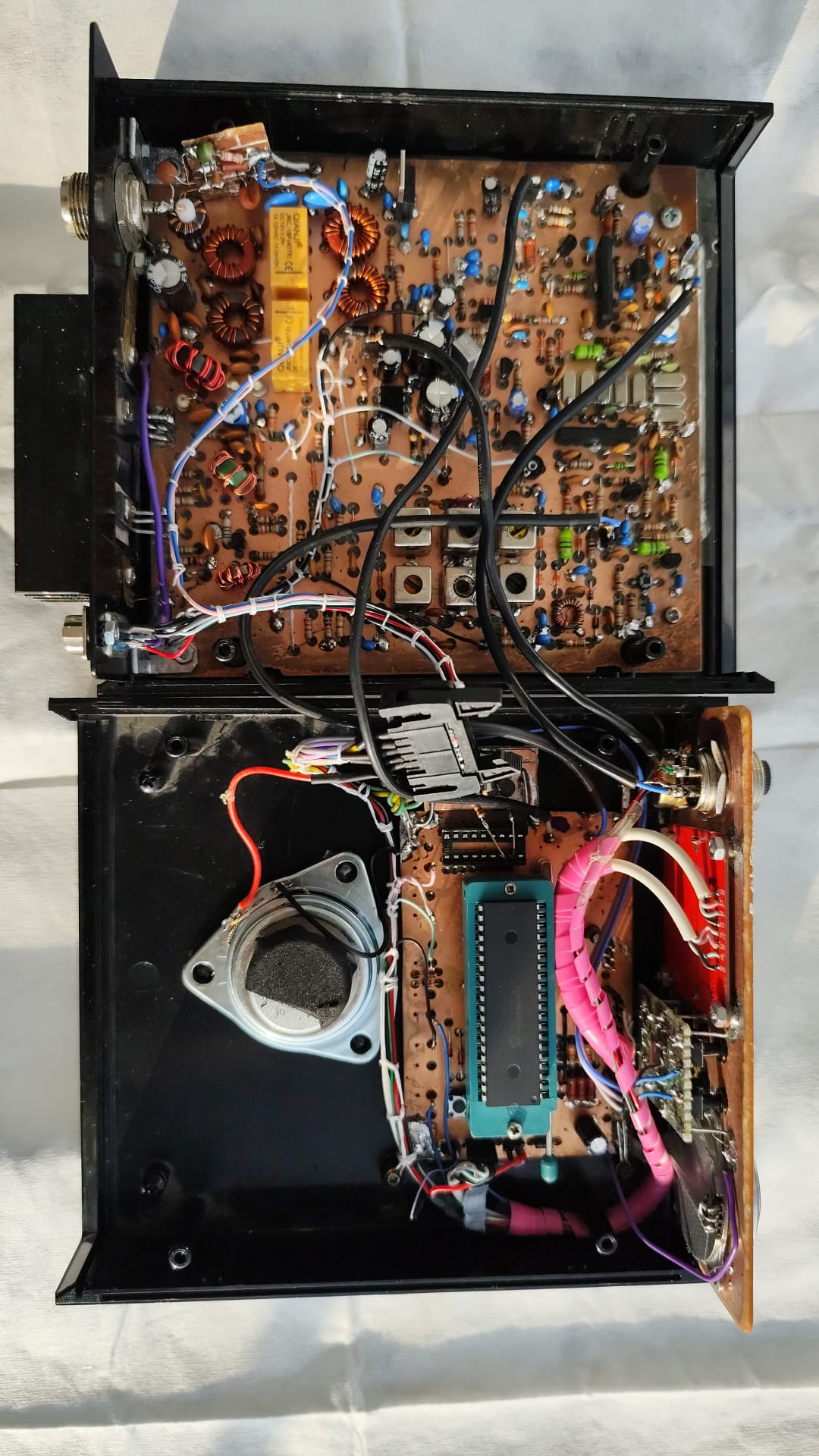 VFO devresini kutunun üst kapağına monte ettim. VFO- ön panel ile alıcı-verici katının bulunduğunalt kapağı birbirine kilitli konnektör ile birleştirdim. Maalesef ekranlı kablolarda böyle bir çözüm mümkün olmadı.
