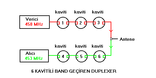 Verici ve alıcı arasındaki yalıtım miktarı kavitilerin büyüklüğünü ve sayısını değiştirerek azaltılıp çoğaltılabilir.Şekile dikkat ederseniz verici çıkışı band geçiren filtrelerden geçtiği için verici gürültüsü ve harmonikleri bu filtrelerde zayıflatılır,böylece vericinin yakın çevresindeki diğer sistemlere enterferans yapmasıda azaltılmış olur.