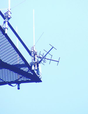 A closeup of the two ATV Yagis protruding from the edge of the platform