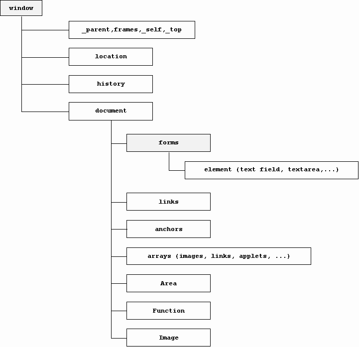 Все встроенные объекты JavaScript берут свое начало от рабочей области Netscape, и их можно представить в виде следующей иерархии: