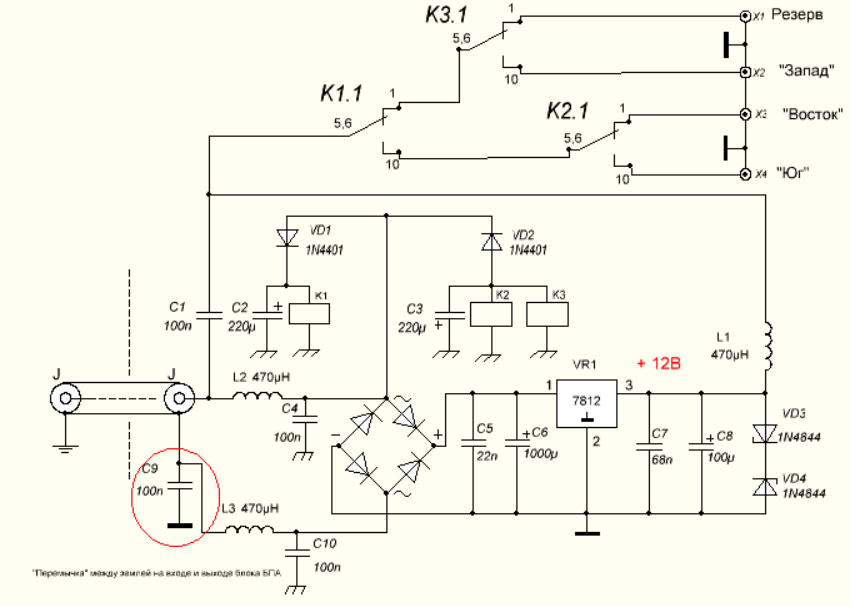 Антенна BigFlag, В. Кошелев – UN5J 1. В ноябре 2007 года я для работы на 40/80/160М установил вертикальную антенну HF2V. Первые связи показали, что антенна на 160М на передачу работает намного лучше моей Inverted Vee, а вот на прием сплошной треск, который позволял мне слышать только мощные радиостанции, при этом аттенюатор трансивера IC-756PROII был установлен на -18 дБ. 2. Для улучшения приема была изготовлена рамочная приемная антенна K9AY. Эта антенна великолепно работала на 30/40/80М, а вот на 160М полное фиаско. Все «ухищрения» при настройке и наладке антенны к положительному результату не привели, она при отсутствии шумов принимала все те же мощные станции. 3. Опыт эксплуатации K9AY в условиях тяжелой городской электромагнитной обстановки показал, что для комфортного приема на 160М необходима антенна независимая от земли и имеющая достаточный периметр рамки. Вот здесь я и обратил внимание на антенну Flag. Эта антенна представляет собой прямоугольную рамку, расположенную вертикально и имеющую размеры 4,3 метра в высоту и 8,8 метра в длину. Классический Flag не требует «земли», однако периметр антенны слишком мал для эффективной работы на 160М. Крыша моего дома позволила смонтировать Flag с длиной горизонтальной части 25 метров, а вертикальной 12 метров. Для монтажа антенны использованы два армейских телескопа длиной 10,5 метра. 4. Да, жизнь на месте не стоит... В конце октября 2014 года я убрал одну рамку своего BigFlag'а и смонтировал две рамки, разработанные Владимиром/RJ3FF, за что ему огромное спасибо! 5. В марте 2018 года я установил на все "углы" двойного флага и на дополнительно установленный перпендикулярно основному полотну одинарный флаг (треугольник) усилители от Игоря dl2kq AD8129. Антенная система работает нормально, шум с запада уменьшился и треугольник начал принимать африканское направление. Да, усилители работали, но появилась сетка пораженных через 1 КГц частот, это вход усилителя перегружался мощными китайскими радиовещательными станциями, что очень мешало приему. Общими усилиями с Антоном/RA0SMS и Валерием/UN7JID пришли к тому, что нужен дополнительный фильтр в полосе от 1,5 до 4 МГц. После установки фильтров сетка исчезла и прием стал комфортным. Ниже смотрите схему фильтра. P.S. По вопросам изготовления фильтров обращаться к Антону/RA0SMS. 5. Все бы хорошо, да наступил грозовой сезон. Прохода на 80/160 почти нет. И закрутилось... Начали один за другим выходить из строя МШУ... Обратился к помощи в радиолюбительское сообщество, но увы... Совместно с Валерием/UN7JID приняли решение по защите обоих входов усилителя диодами 1N4148 включенными между выводами 1(8) на массу усилителя. Сезон гроз ушел... Для переключения антенной системы на три направления мною был изготовлен новый блок управления антеннами, принципиальную схему вы можете видеть ниже.