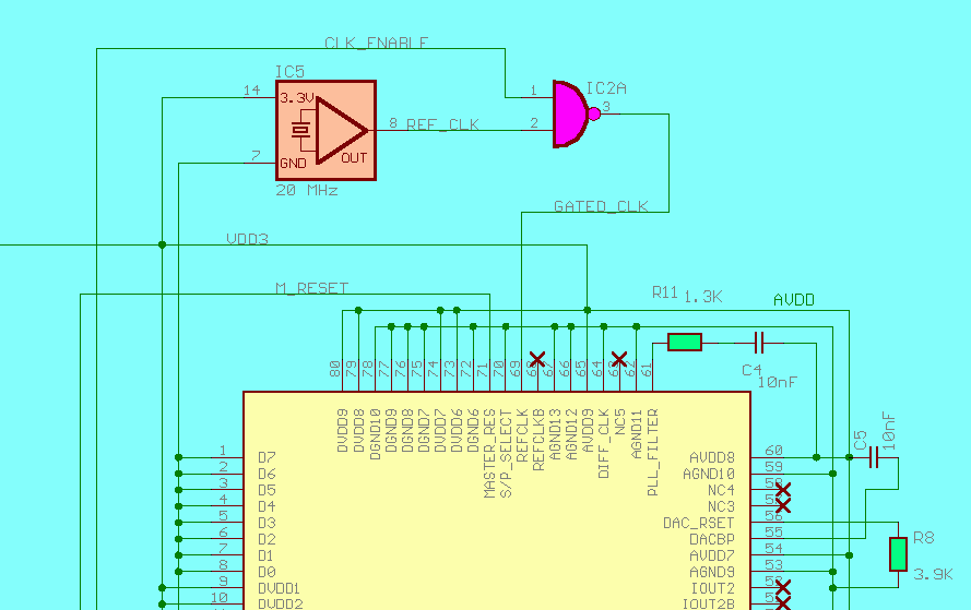 | Эту часть схемы я выделил, чтобы показать элементы тактировки DDS. При внимательном изучении даташита на DDS оказалось, что самую первую установку режима обмена по последовательному интерфейсу надо вводить при отключенном тактовом генераторе. В противном случае режим ввода прерывался и установка микросхемой не принималась. Если есть возможность применить кварцевый генератор с управлением логическим уровнем, тогда необходимость в логическом элементе отпадает. Я применил генератор на 20 МГц, однако если кому-то удасться найти и использовать генератор непосредственно на 160-200 МГц, то он, скорее всего, будет награжден более высокими шумовыми характеристиками всего синтезатора. Фирма утверждает, что применение внутреннего PLL (умножение частоты с 20 МГц до 200 МГц) особо выходной сигнал не облагораживает. Да оно и понятно... | |