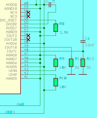 Оба выхода DDS нагружены на резисторы 51 Ом (R12 и R13). Сигнал снял с одного из них. Рекомендации производителя - использовать противофазные выходные сигналы с последующим трансформаторным выходом. Опять-таки, битва за минимальные шумы. Входы быстродействующего компаратора (несмотря на то, что он в моем случае отключен и не используется) необходимо "привязать" к уровням земле и питания (через резисторы R8 и R9). Резистором R8 устанвливается выходной ток (а следовательно, и амплитуда сигнала на резисторах R12 и R13). Через конденсатор C6 выходной сигнал подается на фильтр. Я уже говорил, что параметрам этого фильтра нужно уделить побольше внимания.