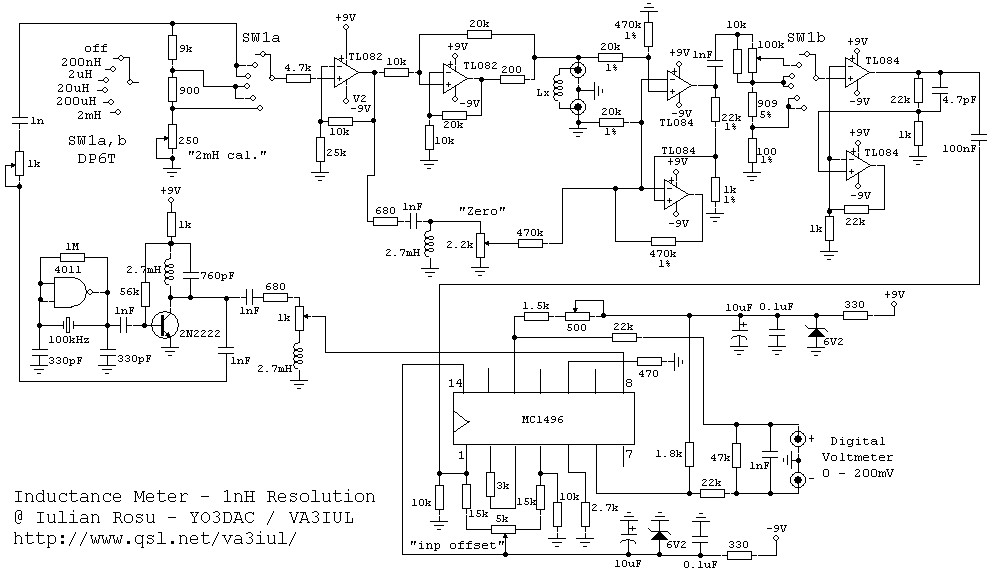 The synchronous demodulation is performed by MC1496, an RF double balanced modulator/demodulator. The phase-shifted reference signal through a passive RLC network, drives the top differential pairs into saturation, while the bottom differential pair is driven linearly by the amplified signal Vx, across Lx. When the reference signal is the same frequency as Vx (across Lx) and is saturating the top pairs, the output of the demodulator is a function of the amplitude and phase of Vx. The output of MC1496 is used differentially to avoid DC drift problems, is filtered and drives the digital voltmeter. The range of the inductance meter is 1nH to 2mH.