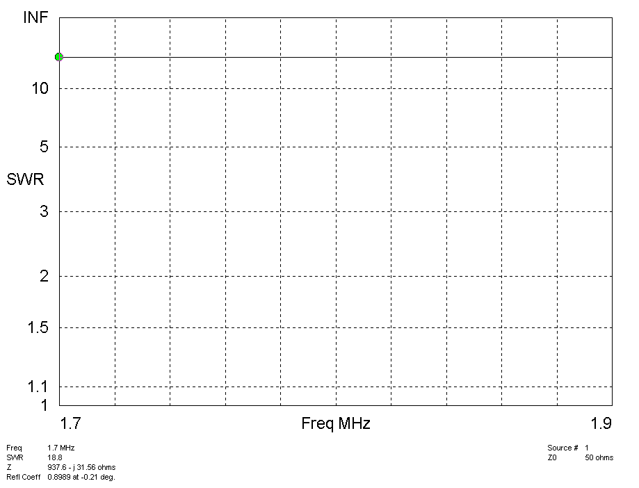 Импеданс антенны показан на следующем рисунке. Он постоянен во всей полосе диапазона 160 метров.