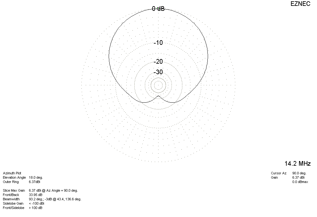 Какие же диаграммы имеет эта антенна? Вот что показывает EZNEC-3.