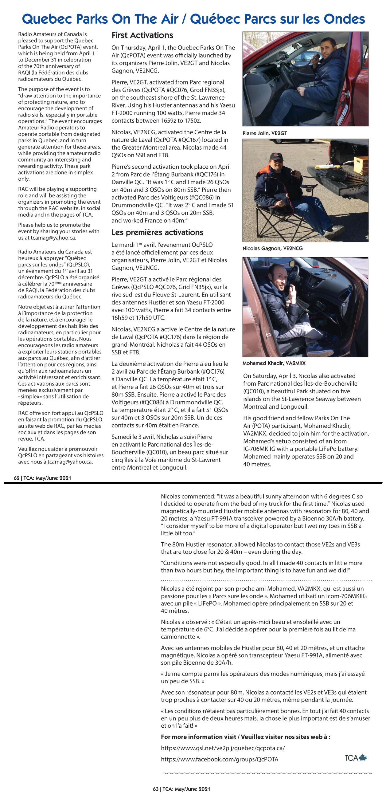 The Quebec Parks On The Air event was featured in the May/June edition of “RAC” magazine.