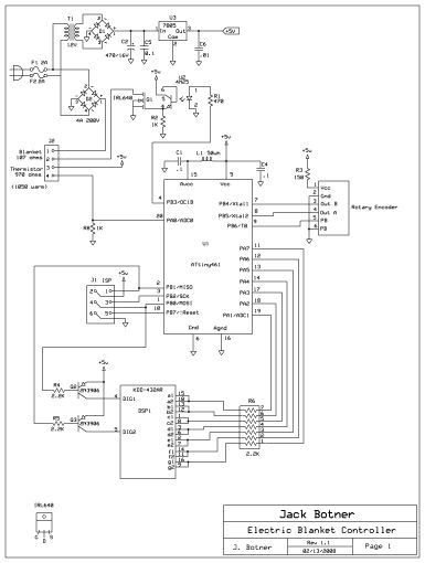 An ATtiny461 is controlling a 2-digit LED display, a rotary encoder, and a power hexfet to provide continuous adjustable power to a resistive load. Most electric blankets appear to be an approimate 100 ohm resistive load. Before you tackle this project, make sure your blanket (or other load) is resistive and consumes no more than 100 watts or so.