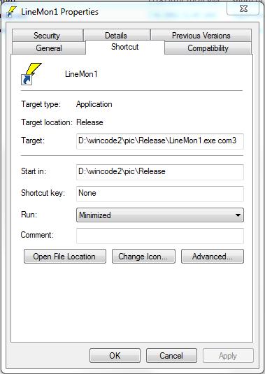 The host program I provide is for Windows 32-bit O/S, and should run on any modern Windows computer. (Also runs fine on Windows 64 bit O/S.) Place the executable anywhere you like on your hard drive. Then create an shortcut/icon for it in your startup folder. Edit the command line to add the COMx parameter; once you attach the USB cable, Windows will install the FTDI driver for you. Example: