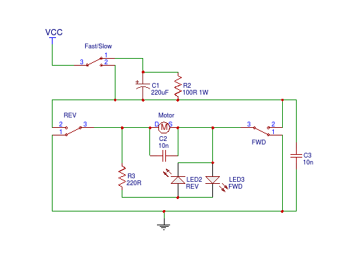 indicate power to the motor and a rocker switch. The rocker switch has a centre off position and