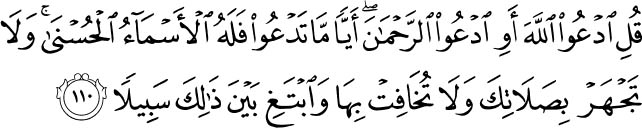 Say, "Call upon Allah or call upon the Most Merciful. Whichever [name] you call - to Him belong the best names." And do not recite [too] loudly in your prayer or [too] quietly but seek between that an [intermediate] way. Holy Quran -17:110