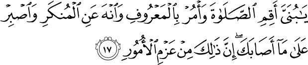 O my son, establish prayer, enjoin what is right, forbid what is wrong, and be patient over what befalls you. Indeed, [all] that is of the matters [requiring] determination. Holy Quran - 31.17