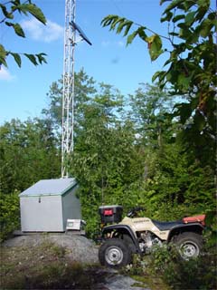 VA3PLA repeater and APRS Digi is located near the hamlet of McArthur Mills, Ontario which is 22 kilometers east of Bancroft, or 120 kilometers North of Belleville and Lake Ontario. It sits atop a 1500 foot AMSL hill with excellent views in most directions. The area is very hilly with valley's at 900' and hill peaks at 1600' ASL. Mobile (30W) coverage is 30 to 50 kilometers. Local hams can stay in touch during recreational activity or beer runs to Bancroft. The only source of power for the repeater is from two solar panels and a storage battery!
