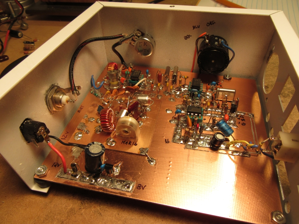 This is my version of Dave Benson's NE40-40 transceiver, but I did not build the transmitter section, at least not yet. It is scratch built ugly, using ground out islands. I found the schematic in QRP Power, and built it according to the original schematic, without the mods, except for a few things at the input (what was on hand), so I could get a good idea of how the original receiver performed, and sounded. Dave's design only has two xtals in the IF, and after hearing how it sounds, and filters out the other side band, I think it's perfect! I have a YouTube video, here , so you can listen, and see how nice this little rcvr sounds. I used a ten turn pot and a junk box varactor diode, which gave me abt. 90 kcs of tuning range!