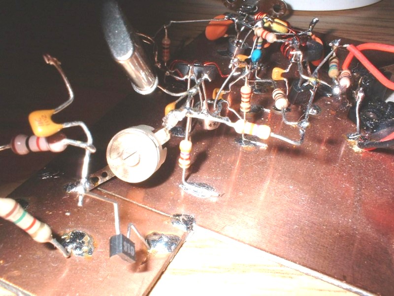 My home brew Tuna Tin II using ugly construction. Actually I think it looks pretty neat like this, and it sure is easy to make changes with this type of construction. The key in the picture is actually a contact from and old relay, I found in my junk box. With a variable trimmer, in series with the xtal, I've been able to pull the frequency to about 7.048. Above shows the trimmer I used to pull the frequency. Below to the left is the varactor diode I hooked up to pull the frequency, but it didn't work as expected. I will be experimenting more with it.