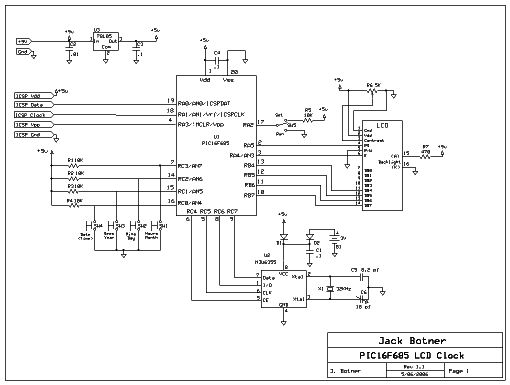 The LCD is the usual backlit 2x16 parallel bus type, except that this one is a bit larger than the standard size. I picked it up years ago and unfortunately I don't recall where. It is driven by the PIC running on a 4MHz internal clock. Time is kept by a battery backed up NJU6355 real-time clock chip. The battery is a 3V coin cell like a CR2032. The knob on the right side is the LCD contrast control R6.