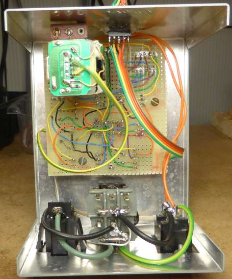The green module in the top left corner of the inside view is the 5V power supply. It came from a USB-type 5V 1A wall-wart switching supply with the case removed. Below the DS1775 is mounted on a surface-mount board, the only way to manage such a tiny part with almost no pins. The relay is 110 VAC 10 amp contacts, with a 5 VDC coil (see below). My relay draws about 200 mA and closes easily at 4V. Any NPN driver transistor can be used as long as it can handle the relay's current.