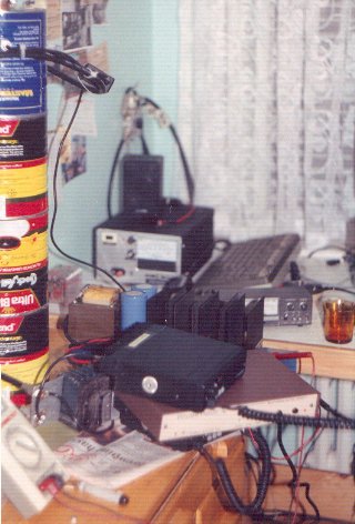 | Przemiennik w częściach, ale pracujący. | Przemiennik zmontowany w jako-taką całość. Niepoważnie wyglądają puszki po kawie, lecz spełniały swoją funkcję i to było ważne. |