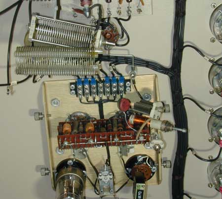 Here is my temporary mod to see if it would work. It did. I built a tank circuit for both the buffer and the driver stages tuned for 75M, to increase the output of each stage and provide a nice clean signal. I now have a perfect sine wave and 25mA of grid drive to the 4-400's! It wasn't this good in it's stock form. I will redo the mods in a neater fashion with buss bar once everything proves out 100%. |