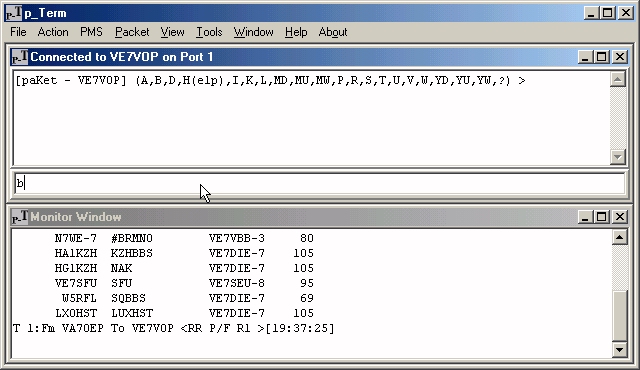 The Moniter Window will continue to moniter the packets on the frequency. After you have finished your business with VE7VOP, it is time to log off. Enter 'b' in the input box of the Connected Window and press the Enter key: