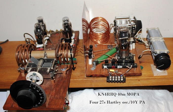 K5CF (sk) - 210 TNT WU2D - 211 160m HARTLEY NE1S - PP 27s 160m HARTLEY W8HOG - 27 HARTLEY W3BBO - 27 HARTLEY / 80 PWR SUPPLY WA3JJT - 27s HARTLEY WK3A - 27s HARTLEY 80m / PWR SUPPLY KK4GFR - Parallel 27s / 76s - HARTLEY W8PU - '25 40m HARTLEY - UX199 VE3SGV - 80m HARTLEY - Arcturus 127 VE3AWA 1BIG HARTLEY - UX-210 KN4RRQ's 4-HOLER HARTLEY VA6FUN - 80m Hartley - parallel 27s KC5U - Colpitts - PP VT-25s W8PU - 1927 MOPA - 301A - 10Y