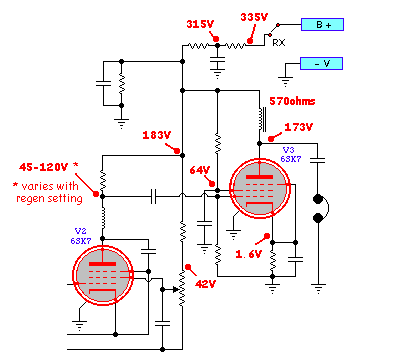 The homebrew power supply built for the project was only able to provide 295 volts which is a little less than desirable but enough to provide a solid 5 watts of QRP output from the 6V6 power-oscillator.The voltage parameters measured on the receiver section are shown below. These can be scaled-up or down if your B+ is significantly different: