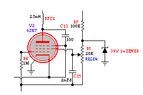 I have read a number of comments from Paraset builders indicating that their receivers were very unstable or jumped frequency when switching from 'transmit' back to 'receive'. I too noticed this condition but it wasn't a severe problem, just an annoying one. I eventually discovered that the 6SK7 tube used in the detector stage was the cause of the frequency shift when switching from 'transmit' to 'receive'. Evidently there were some inter-element expansion / contraction problems within the tube related to the cooling-down period while transmitting and then powering-up the detector when switching back to receive. A different 6SK7 did not exhibit any sign of the problem, resulting in no frequency shifting when going back to 'receive' mode. I did still have a problem with the receive frequency frequently drifting up or down several kHz whenever my line voltage changed. Living in a rural location, I have noticed that the line voltage will suddenly change by several volts from time-to-time. The change results in a small but noticeable change in the sensitive screen voltage which controls regeneration. Any change in this voltage also causes a corresponding change in the oscillator's frequency. A quick and simple cure was to clamp the top-end of the regenertion control (R5) with a 39V 1watt zener diode. The improvement was immediate as the stiff screen supply refused to budge even when the line voltage shifted. Once warmed-up, the receiver will stay put on its set frequency with no noticeable changes: