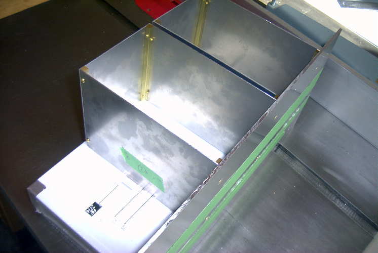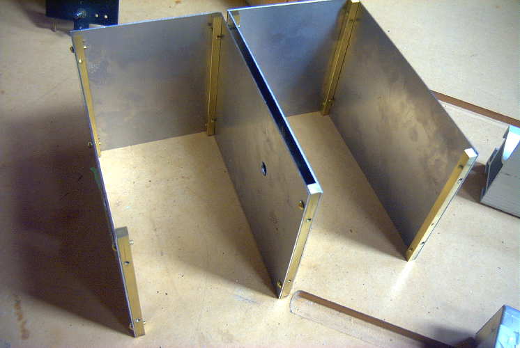 Construction began by building the two shielded compartments. The 'scraps' table of the nearest Metal Supermarket provided the 20 gauge aluminum (still in protective covering) along with the 1/4" square brass bar stock needed for the corners. All of the holes drilled in the brass corner pieces were tapped to accept 4-40 brass screws.
