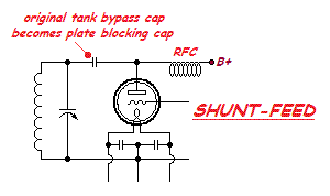 As noted above, I strongly recommend that all TNT's be changed to a shunt-fed plate in order to remove the high voltage from the exposed plate coil and variable capacitor. It requires no extra parts to make the change as shown below: