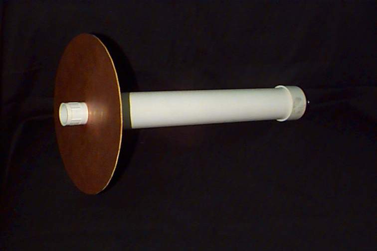 The parts shown here are a Copper or PCB Disk 90mm Radius, a piece of 40mm ID water Conduit 305mm long, 1X 40mm end cap with a 10mm hole and one with a 20mm hole so suit the threaded conduit terminator. These parts form the housing for the converter. The second image is the conduit terminator that holds the 20mm OD electrical conuit. It sandwiches the groundplane between itself and the 40mm end cap as shown below.