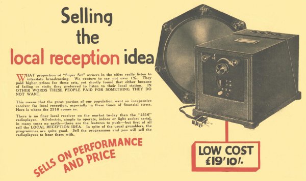 The Type 2516 had a 4 position jumper selector, called a "quad selector", below which was the push button On-Off switch. The 2516 would usually work with an indoor aerial and no earth but in position 4 of the selector the aerial was connected to the mains through a plug into the light socket (hopefully via a capacitor!). It had a socket for a gramophone input and was claimed to be easily portable so that it could be carried from room to room. The suggested speaker for the 2516 was the low priced Baby Grand.