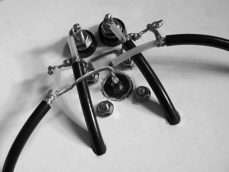 Insert one end of each of the two coaxial cables through the centre 2 holes, and terminate the inners to the two open wire line terminals, and the outers (braid) to the copper wire bonding ring around the socket.