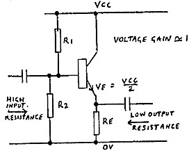 The emitter follower is a very useful special form of voltage amplifier. It has high input resistance, low output resistance and a gain just less than one. Its input resistance is approximately equal to the load resistance at its output circuit multiplied by Hfe. If base stabilising resistors are used as shown by R1 and R2 in figure 7, these must also be considered as part of the input resistance in parallel and in fact when used, are usually the main input resistance determining factor.