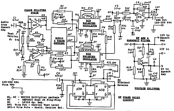 Concerning residual carrier balance, a later addition was the inclusion of trimpots RV3 and RV4 which allow individual adjustment balance of the two balanced modulators and further improvement in the rejection of residual carrier.