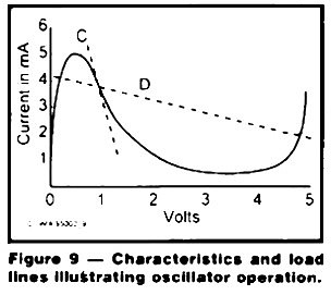 The value of negative resistance is determined by the slope of the curve and, for stable operation at the operating point, the bias supply must have a lower source resistance than the value of negative resistance. On the other hand, too low a source resistance can cause the diode to oscillate at a frequency determined by its inherent self inductance and capacitance. Hence the value of bias supply source resistance can be critical. Its value is represented by load line curve C in Figure 9. A circuit for a 100 MHz oscillator is shown in Figure 10. For the circuit to oscillate at the required frequency, the shunt resistance presented by the tuned circuit L-C1 at resonance must be not less than the value of negative resistance. The resistance presented by the tuned circuit is represented by load line D in Figure 9.
