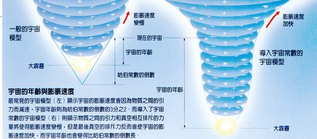 不單是宇宙年齡,宇宙膨脹的速度已經加快的問題也和宇宙的未來關係密切。宇宙究竟是在哪個時點轉為收縮,又是在哪個時點平緩而持續膨脹並加速